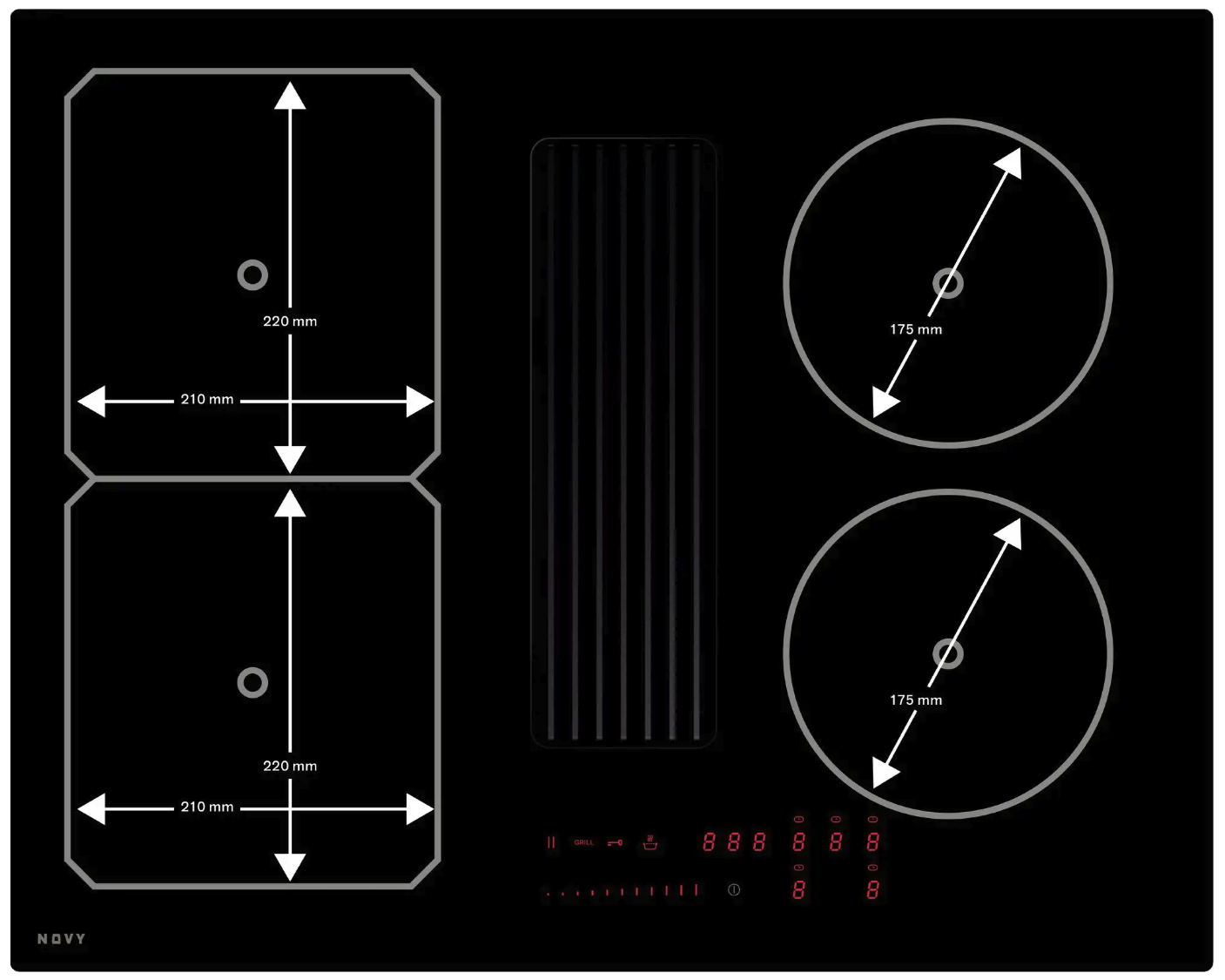 Novy Muldenlüfter 80 Easy 1861 (Mattglas 1861-g1 ) Induktionskochfeld 80 cm 4 x Kochzonen mit Flächeninduktion Umluft mit Monoblockfilter oder Abluft nach aussen mit der Type 1851 bzw. Mattglas 1851-g1.